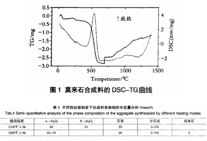 將原料放在共磨機中以料:球:水重量比1:1:1濕法共磨,轉速為300rpm。研磨時間為24小時,將共磨后的物料在直徑為30mm,高為50mm的圓柱形模具中成型。成型試樣在110℃干燥箱中烘干24小時,然后進行熱處理。試樣在空氣中自然干燥48小時后脫模。把工業氧化鋁配好的混合料進行了DSC-TG和大試樣熱重分析,以此判定無煙煤的燒失溫度和莫來石化的開始溫度。為進而制定合理的熱處理制度提供依據。比較了兩種煅燒制度對莫來石轉化率的影響:一為單調升溫,然后保溫;另一為在高低兩個溫度分段保溫。如表2、表3。按相關標準檢測了燒后試樣的體積密度、顯氣孔率。